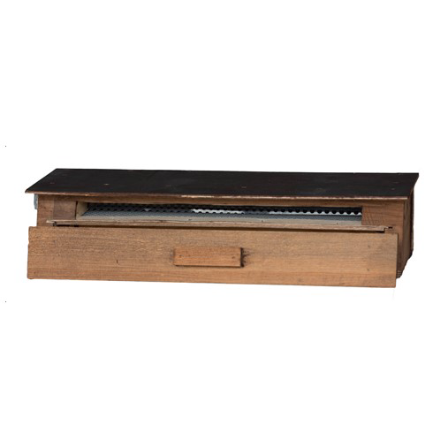 Fluglochvorsatz aus Holz mit seitlich herausziehbarem Rundlochkamm und Kunststoffschale.